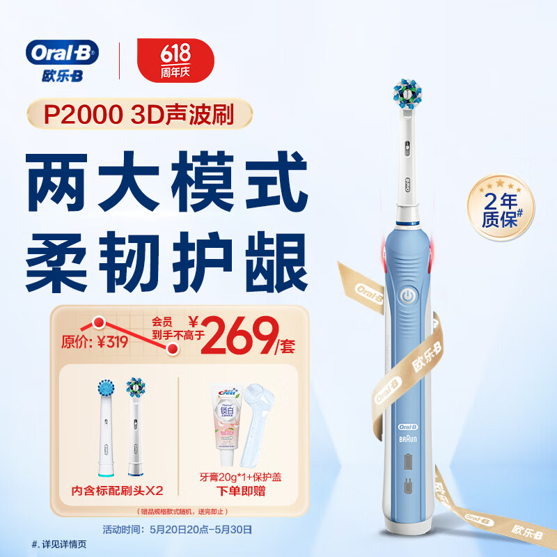 欧乐B电动牙刷成人P2000蓝 P系列圆头情侣礼物3D声波旋转摆动充电式日常清洁博朗精工生日礼物520礼物价格:319.00元!