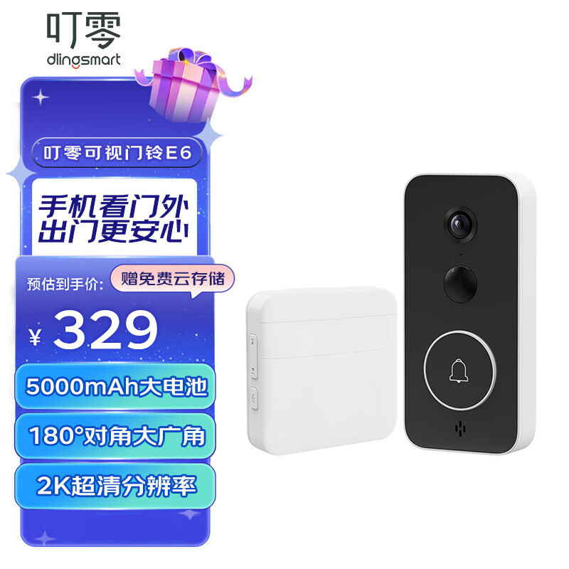 叮零 可视门铃 E6摄像头 300万像素长续航家用摄像机远程智能电子猫眼无线 WiFi 超清夜视对讲价格:499.00元!