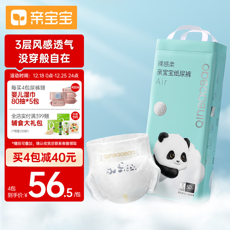 亲宝宝裸感柔Air纸尿裤M50片(6-11kg)中号尿不湿超薄干爽透气尿片价格:54.00元!