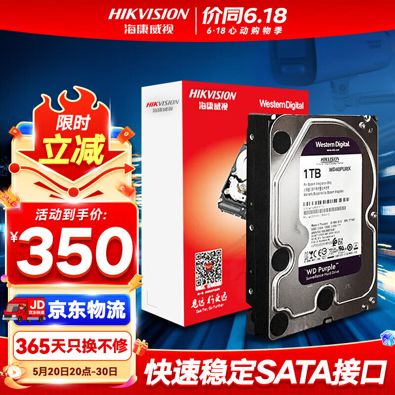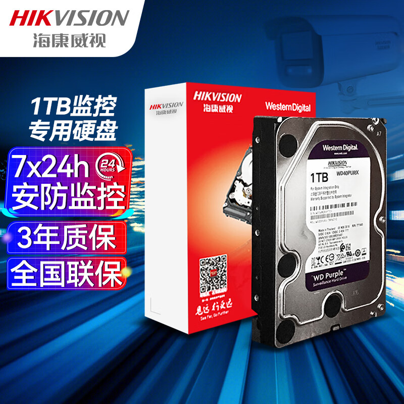 HIKVISION海康威视监控专用硬盘1TB 西部数据机械硬盘 安防视频录像机紫盘 5400转 64MB SATA6Gb/秒价格:350.00元!