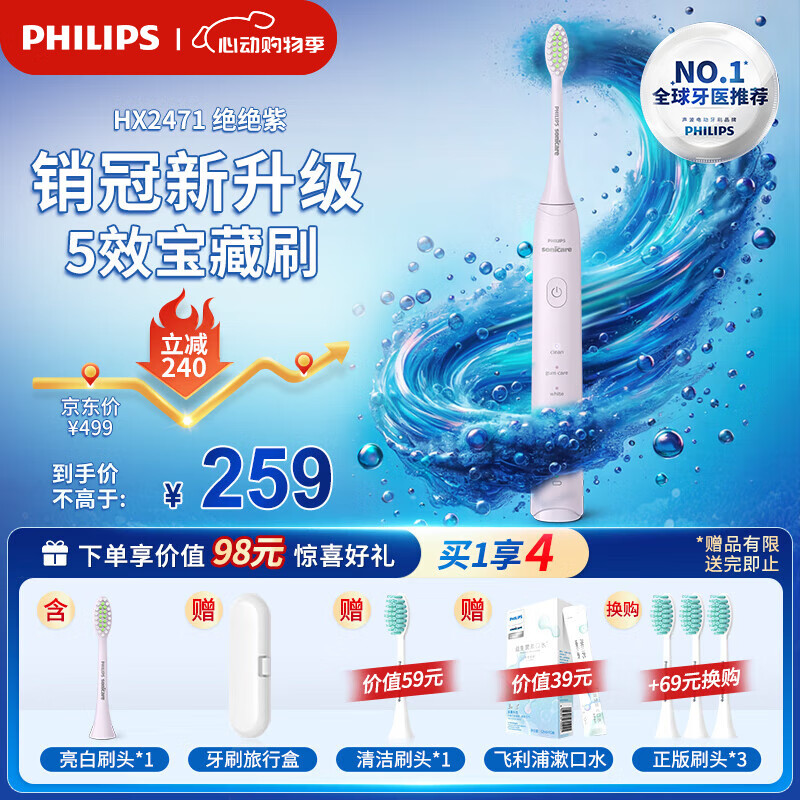 飞利浦电动牙刷S3成人情侣款送女友/男友生日礼物 5种模式 软毛柔和亮白刷头 5效宝藏刷 520情人节礼物 绝绝紫 HX2471/02价格:499.00元!