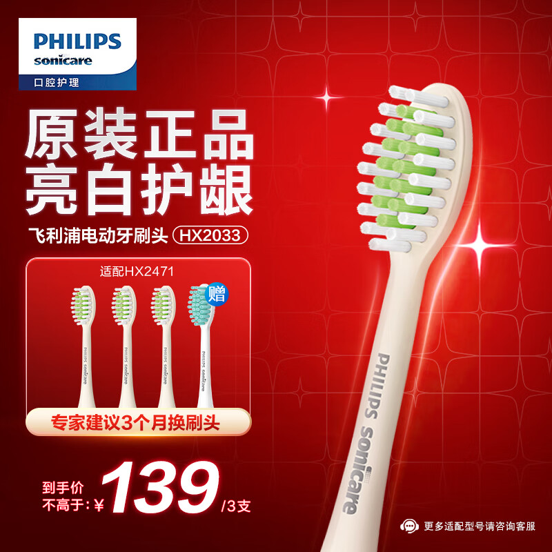 飞利浦(PHILIPS)电动牙刷头HX2033/05 柔和亮白刷头 3支装 适配5效宝藏刷瑞斯白 HX2471/03价格:139.00元!