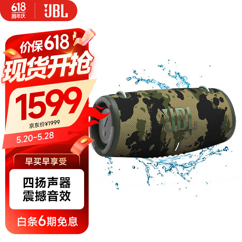 JBL XTREME3 音乐战鼓三代 便携蓝牙音箱 户外音箱 电脑音响 低音炮 四扬声器系统 防尘防水 迷彩色价格:1599.00元!