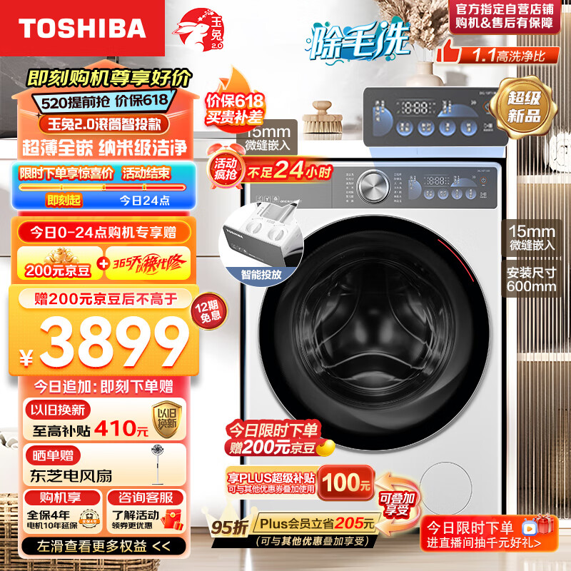 东芝(TOSHIBA)滚筒洗衣机全自动【玉兔2.0 DG-10T19BI】超薄全嵌 10公斤大容量 智能投放 银离子除菌价格:4099.00元!