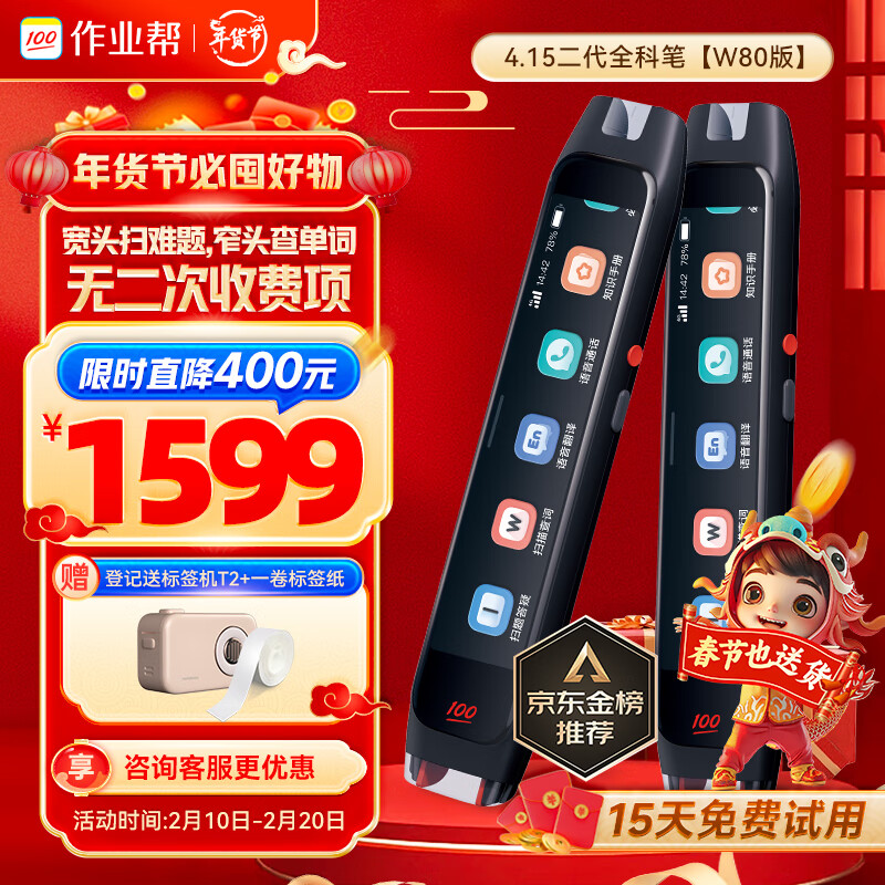 作业帮全科学习笔二代博学版W80 【无二次收费】小初高原题精讲 4.15英寸 中英文点读笔学习机词典笔价格:1599.00元!