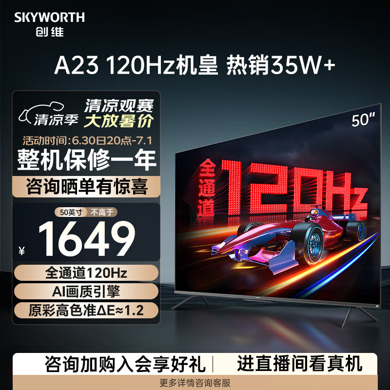创维电视50A23 50英寸电视机全通道120Hz 2+32G4K超高清护眼声控屏智能液晶价格:1649.00元!