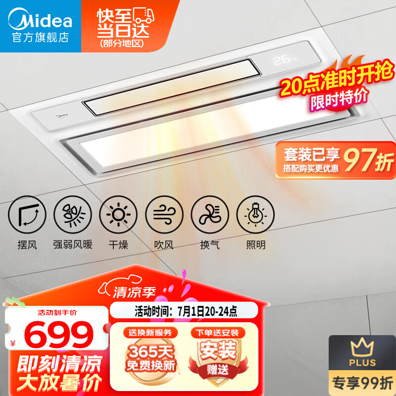 美的(Midea)浴霸风暖照明一体300*600集成吊顶浴室取暖器换气排气浴室暖风机价格:799.00元!