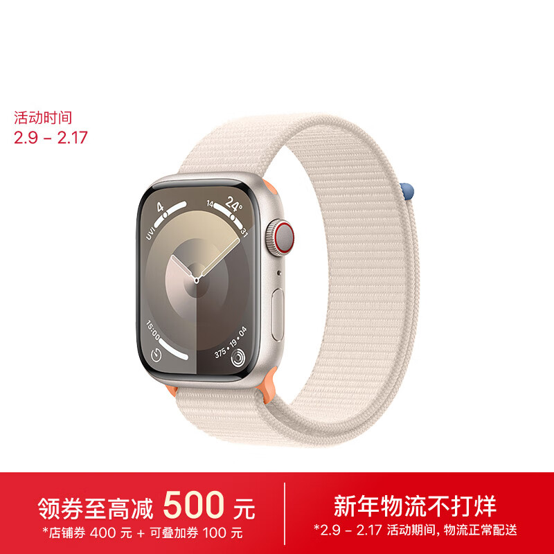 Apple/苹果 Watch Series 9 智能手表GPS+蜂窝款45毫米星光色铝金属表壳星光色回环式表带 MRP43CH/A价格:3999.00元!