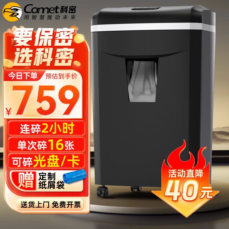科密(comet)大吞吐长时间专业销毁碎纸机(单次16张 持续碎120分钟 25L 可碎卡、光盘、订书针)1625D价格:799.00元!