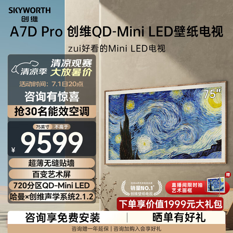 创维壁纸电视75A7D Pro 欧洲杯75英寸超薄壁画艺术电视机 无缝贴墙 720分区量子点Mini LED液晶电视价格:9599.00元!