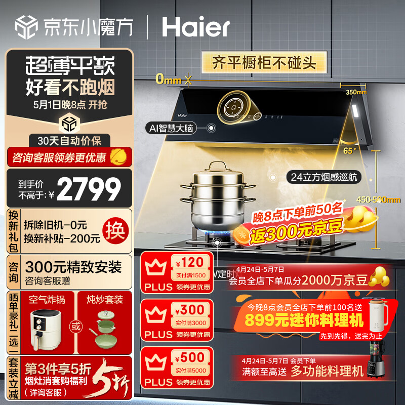 海尔(Haier)抽油烟机 超薄近吸烟灶套装 24m3/min有效风顶侧双吸外观 家用厨房吸油烟机燃气灶具C30套装价格:2799.00元!