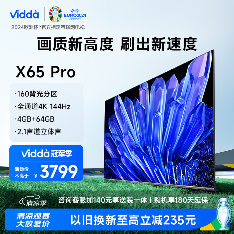 Vidda X65 Pro 海信电视 65英寸 144Hz游戏 160背光分区 4+64G 液晶欧洲杯大屏电视以旧换新65V3K-PRO价格:3799.00元!
