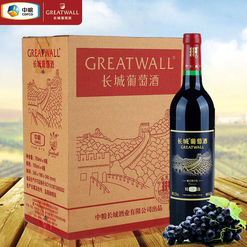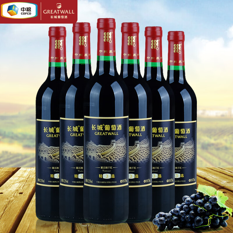 长城(GreatWall)精选3彩标解百纳干红葡萄酒 中秋送礼国货红酒整箱装750mL*6瓶价格:265.00元!