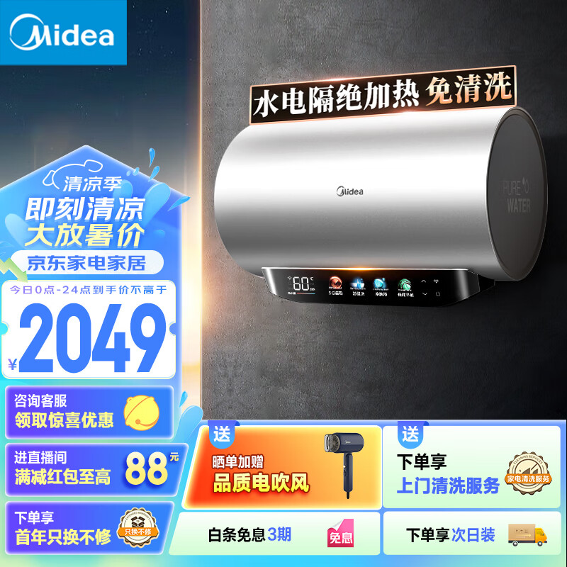 美的(Midea)水电分离80升电热水器家用 3300W变频10重过滤净肤瓷净舱除余氯内胆免清洗以旧换新F8033-PE9(HE)价格:2249.00元!