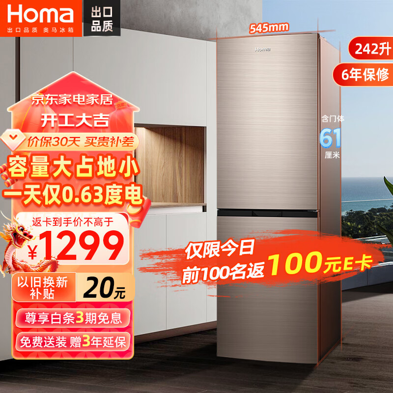 奥马(Homa)242升风冷无霜大容量双开门电冰箱 两门二门节能 小户型家用租房办公 冷冻分储 BCD-242WH价格:1399.00元!