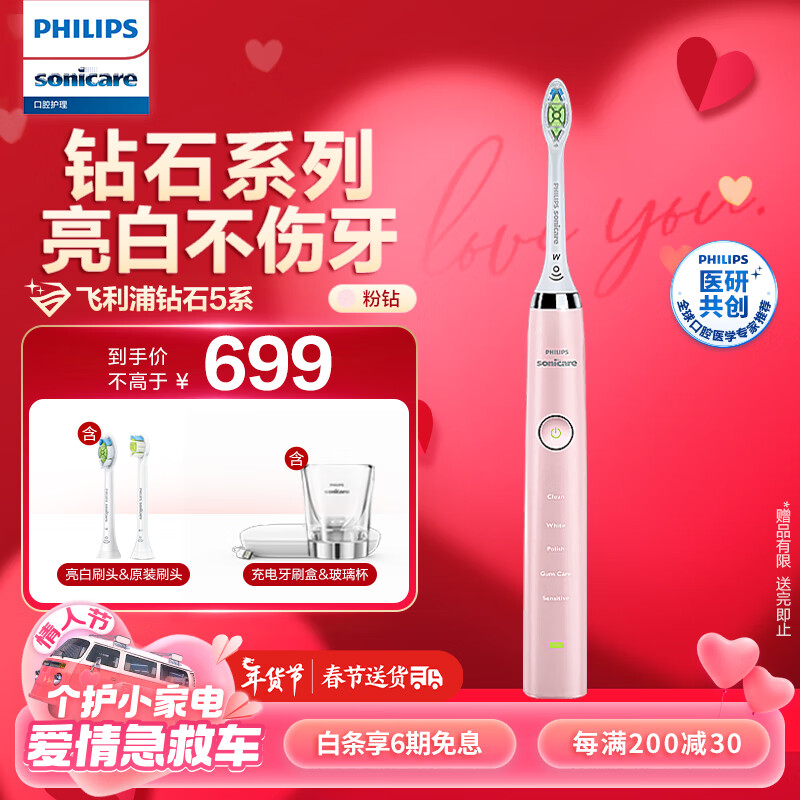 飞利浦(PHILIPS)电动牙刷成人 新年 情人节礼物 送女友/男友粉钻含刷头*2+充电旅行盒+充电玻璃杯 钻石5系粉色价格:819.00元!