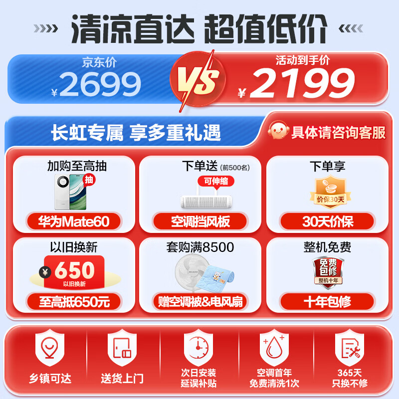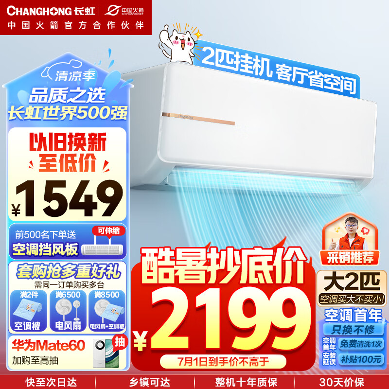 长虹(CHANGHONG)空调 大2匹挂机 升级新能效省电 变频冷暖 精准控温自清洁 空调挂机KFR-51GW/ZDTCW2+R3以旧换新价格:3399.00元!