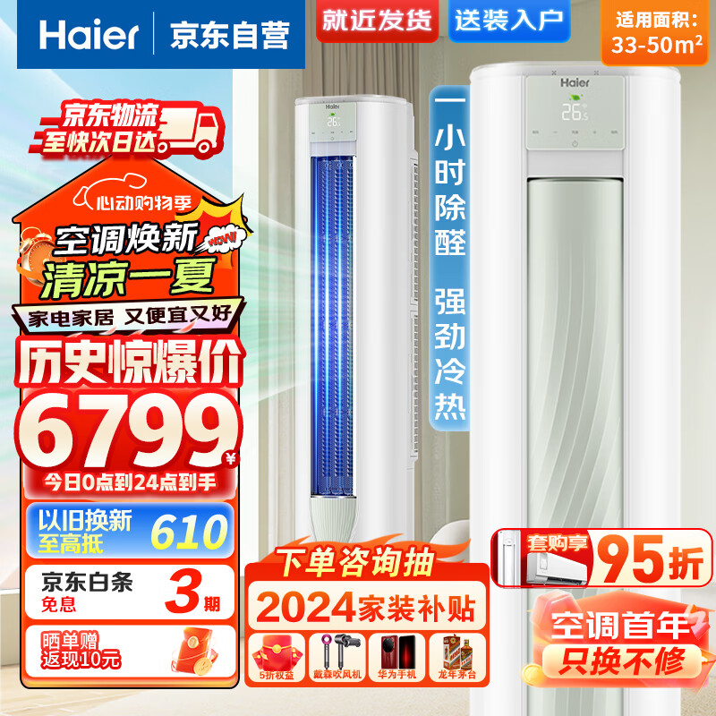 海尔3匹空调劲爽除醛柜机变频冷暖极速一级能效自清洁客厅家用圆柱空调立式柜机以旧换新 72LGA81价格:6799.00元!