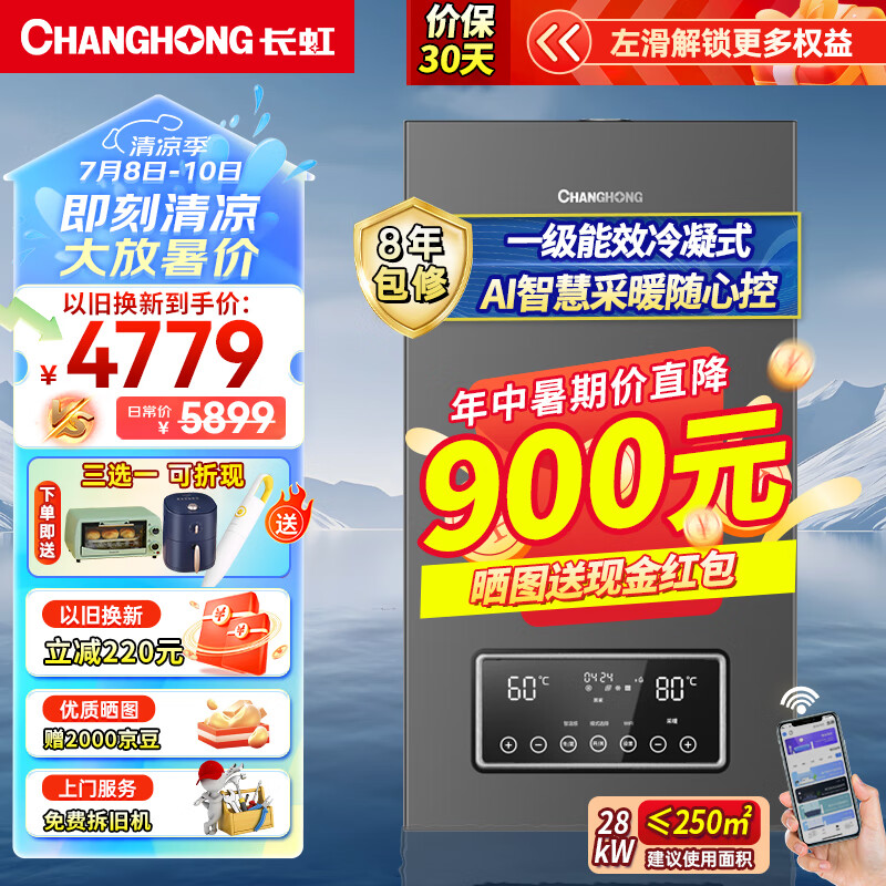 长虹(CHANGHONG)燃气壁挂炉家用天然气供暖一级能效冷凝式节能省气APP智控锅炉暖气片地暖热水两用以旧换新28C6价格:5899.00元!