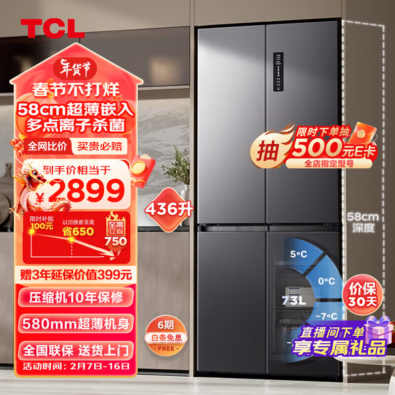 TCL58厘米超薄平嵌436升大容量一级双变频十字对开门四开门家用电冰箱超薄可嵌入R436T5-U晶岩灰价格:2899.00元!