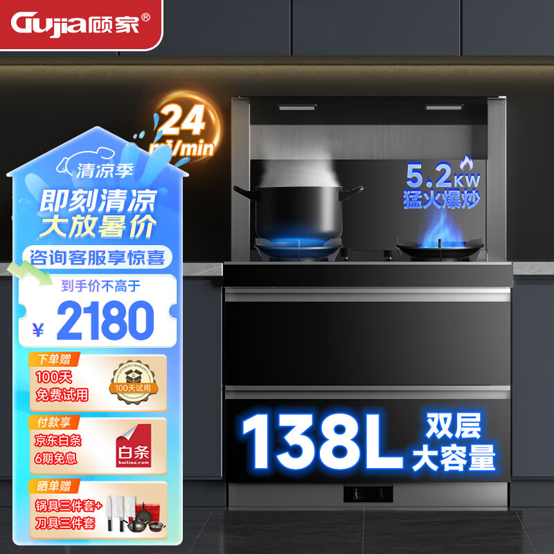 顾家(Gujia)集成灶一体式侧吸抽油烟机5.2KW燃气灶家用138L大容量储物柜JJZT-A-GF天然气价格:2480.00元!