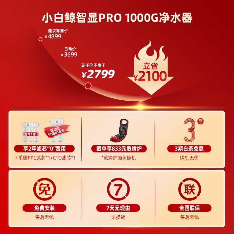 沁园(TRULIVA)小白鲸pro升级版智能龙头1000G家用净水器5年RO反渗透厨下直饮3.0L/分钟 UR-S51076i价格:2799.00元!