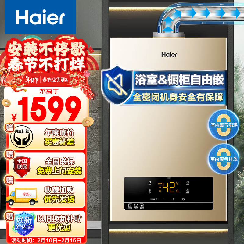 海尔(Haier)13升燃气热水器天然气 平衡式 室内平衡式 精控恒温 智能变升浴室安装 JSG25-13ZH3(12T)价格:1699.00元!