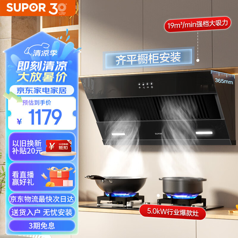 苏泊尔(SUPOR)抽油烟机燃气灶套装 家用小尺寸大吸力 19立方侧吸式小户型烟灶套装 DJ13S+Q5液化气价格:1179.00元!