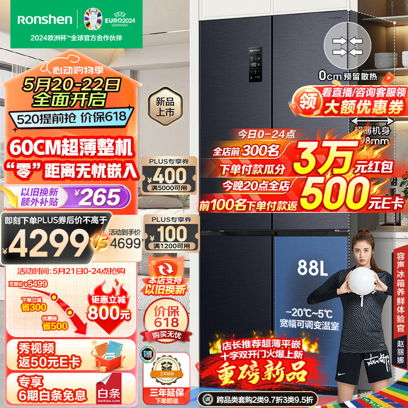 容声(Ronshen)60cm薄503升平嵌Pro十字双开四开门超薄嵌入式冰箱灰色家用除菌净味底部散热BCD-503WD1FPQLA变温价格:5499.00元!