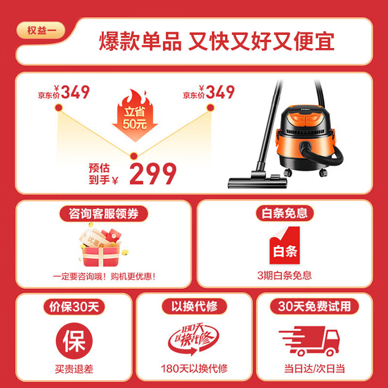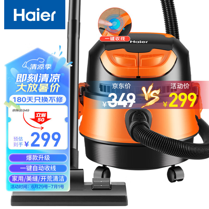 海尔(Haier)桶式吸尘器 15L大容量干湿吹多功能家用强劲大吸力吸尘器一键自动收线HZ-T615 pro价格:299.00元!
