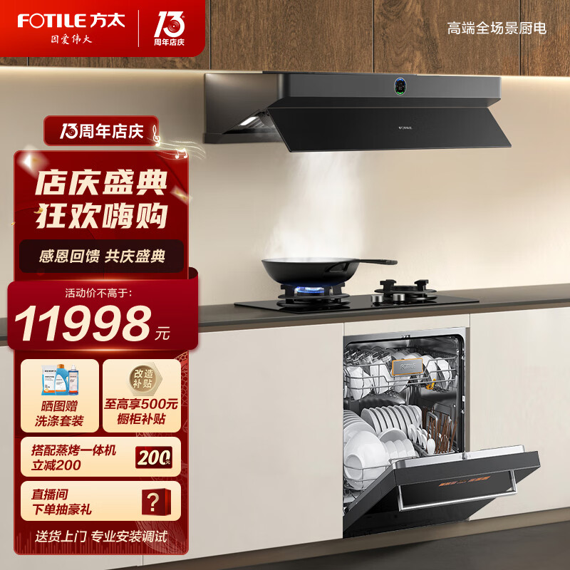 方太(FOTILE)烟灶洗三件套 24风量侧吸欧近一体变频油烟机 5.0kW烟灶联动灶 15套嵌洗 01-F2.i+THF1-G+VF1.i价格:11998.00元!