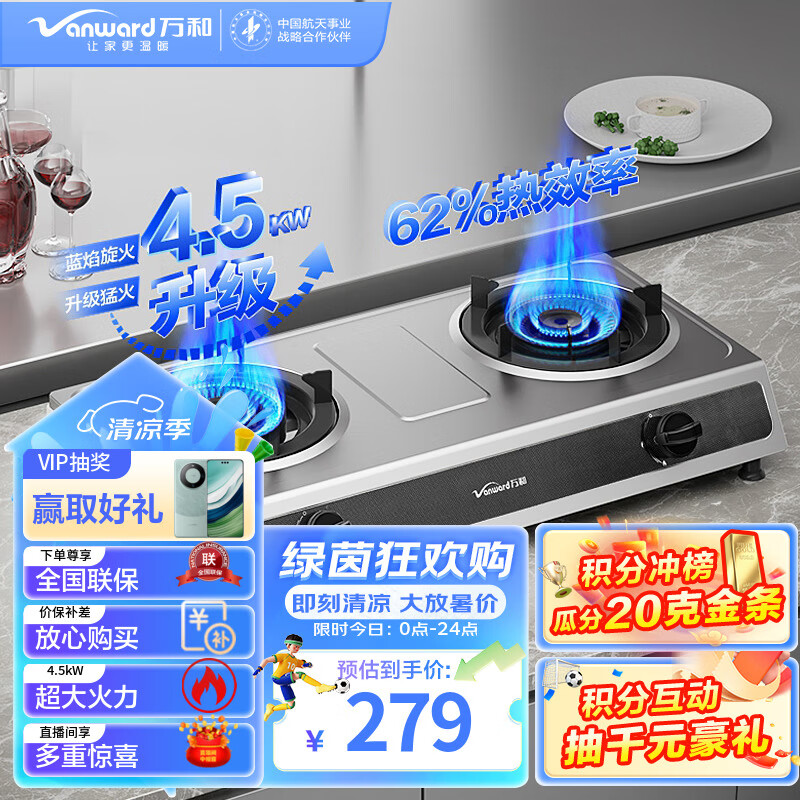 万和(Vanward)燃气灶具 不锈钢家用台式燃气灶 62%热效率天然气灶具 4.5KW大火力 JZT-D9B28(天然气)价格:279.00元!