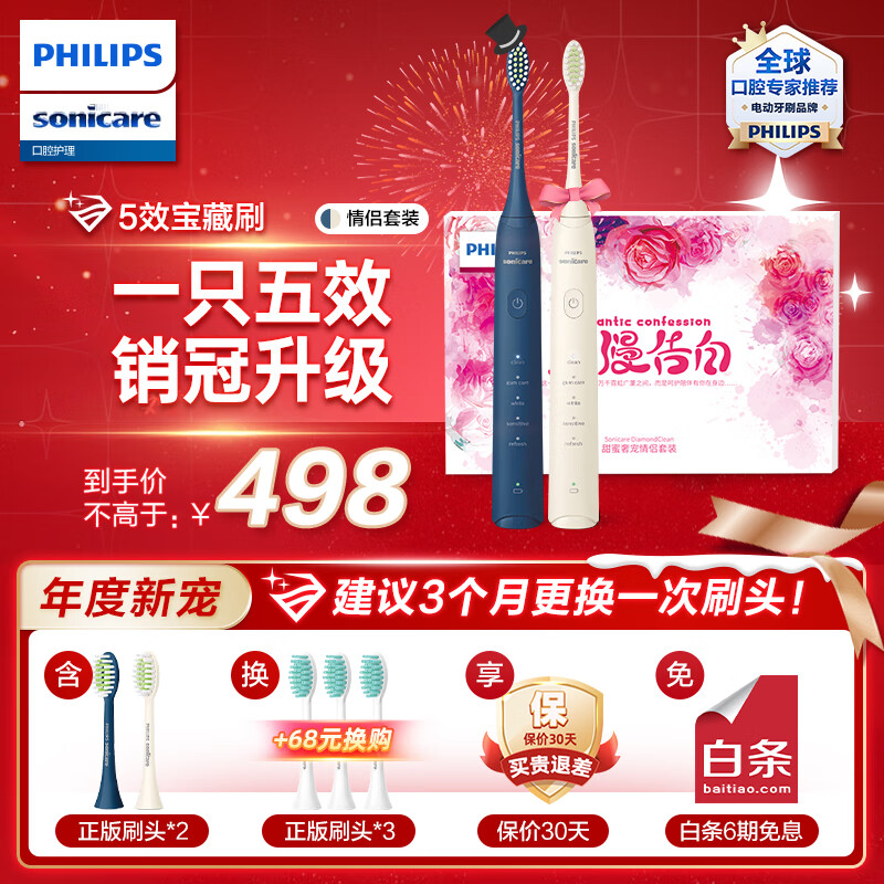 飞利浦(PHILIPS)电动牙刷成人净齿呵护型声波震动牙刷 高颜值情侣款牙刷 HX2471【情侣套装礼盒】蓝+白价格:598.00元!