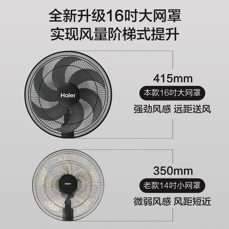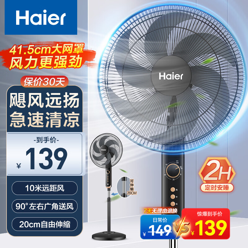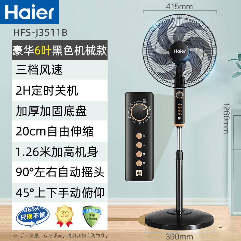 海尔(Haier)电风扇家用落地扇立式大风量摇头电扇客厅宿舍节能办公室柔风轻音易拆洗六叶风扇 HFS-J3511B价格:122.50元!