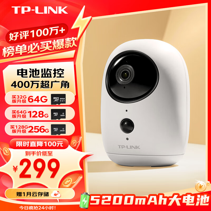 TP-link 400万电池版家用摄像头无线监控器360度全景室内可对话网络手机远程门口高清婴儿看护器IPC44B价格:329.00元!