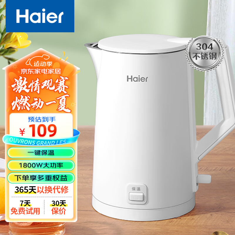海尔(Haier)电水壶双层防烫烧水壶316不锈钢无缝内胆低音烧水保温电热水壶1.7L大容量 白HKT-K8B17W升级价格:109.00元!