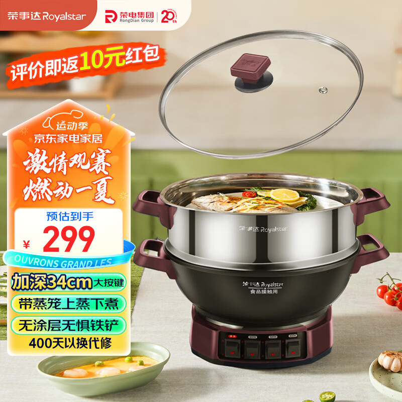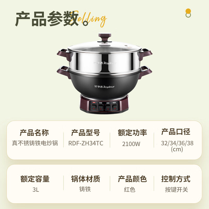 荣事达(Royalstar)电炒锅 加深家用铸铁多功能电热锅电铸铁锅炒锅多用途锅电锅电煮锅电火锅电蒸锅 RDG-ZH34TC1价格:299.00元!