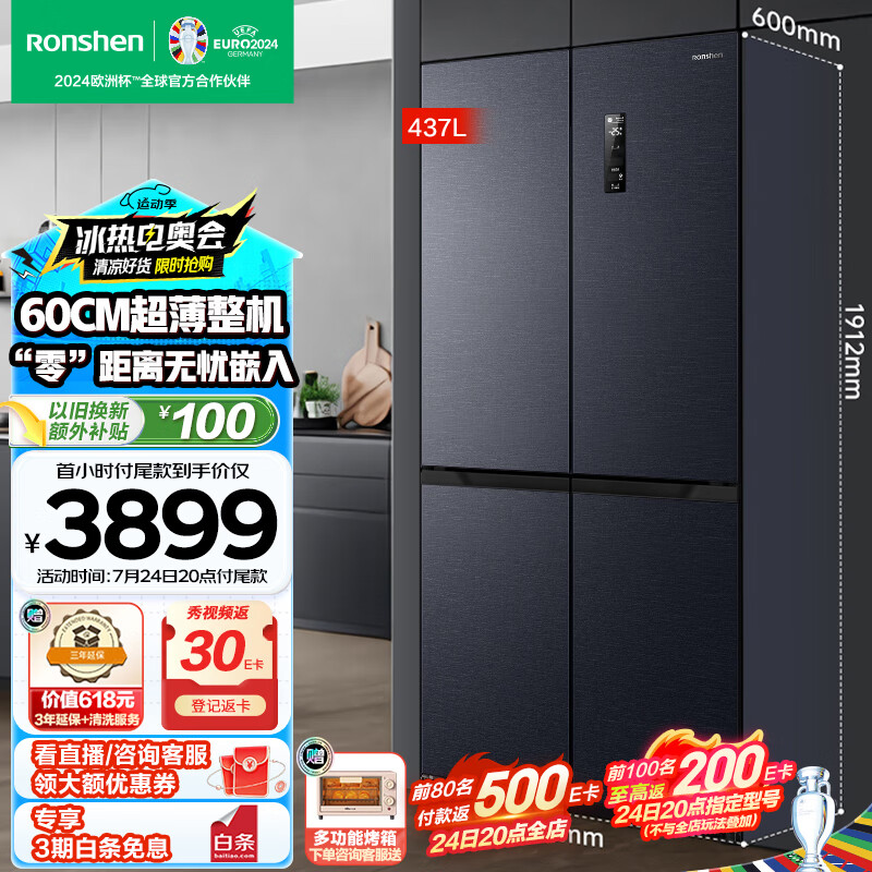 容声(Ronshen)60cm薄437升平嵌十字双对开四开多门超薄嵌入式冰箱灰色家用变频一级无霜底部散热BCD-437WD1FPQL价格:4399.00元!