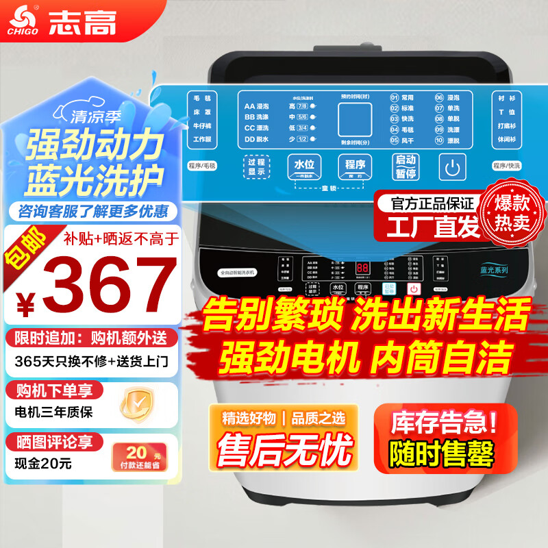 志高(CHIGO)洗衣机大容量家用全自动波轮洗衣机8公斤 智能洗脱一体机 蓝光洗护强劲电机仿生手洗 灰色价格:388.00元!