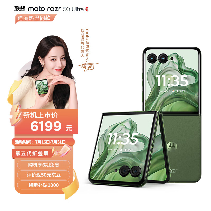 摩托罗拉 联想moto razr 50 Ultra 第五代折叠屏 4吋无界大外屏 双卡 5G手机 AI元启版 12+512GB 摩登艾绿价格:6199.00元!