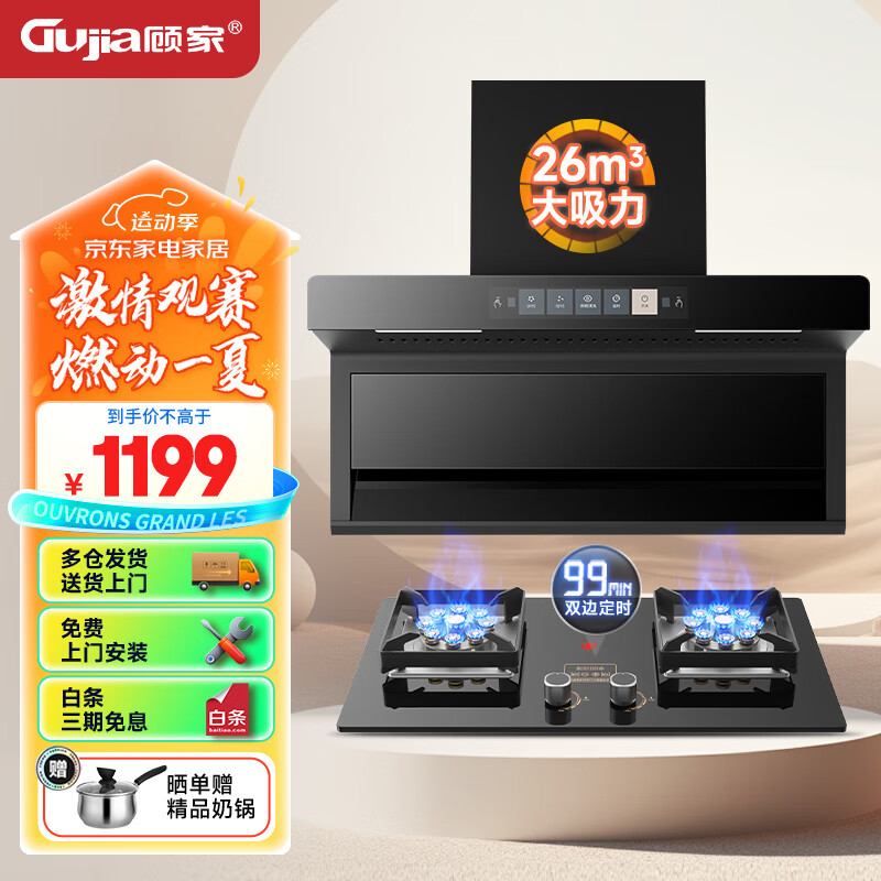 顾家(Gujia)顶侧双吸油烟机7字型抽油烟机灶具套装26立方大吸力家用油烟机燃气灶两件套((液化气)价格:1499.00元!