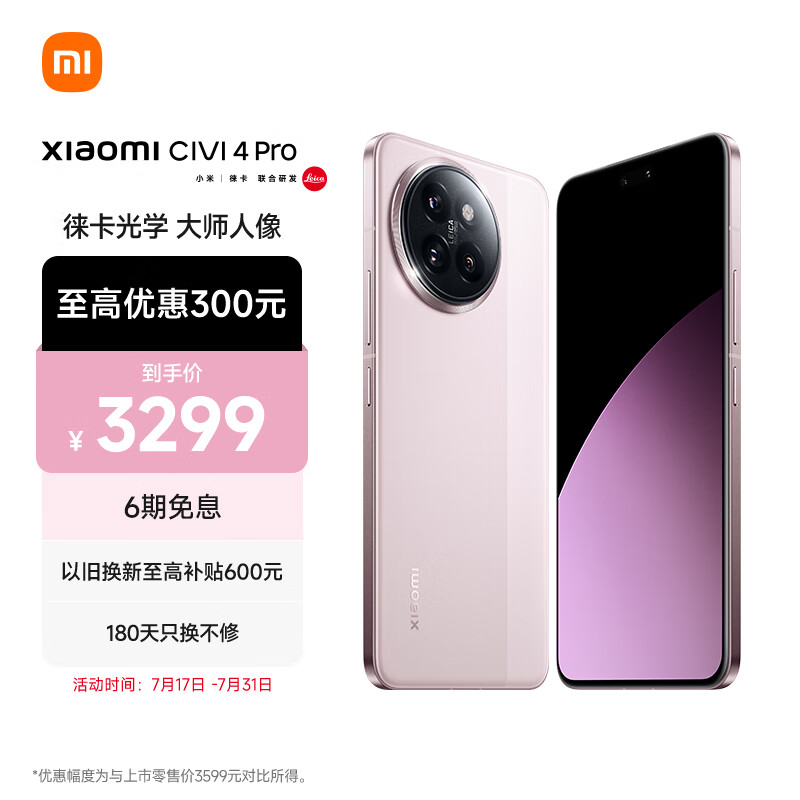小米Civi 4 Pro 第三代骁龙8s 5000万徕卡专业人像镜头 16GB+512GB 柔雾粉 5G拍照AI手机 小米澎湃OS价格:3299.00元!