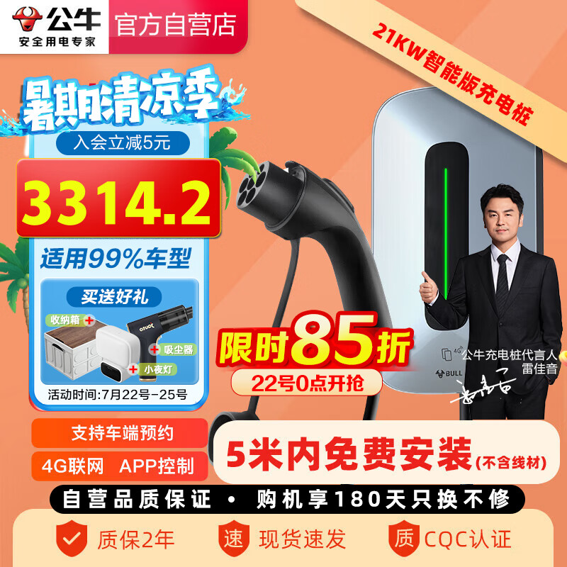 公牛(BULL)新能源汽车交流充电桩适配特斯拉比亚迪小米su7汽车等车型向下兼容智能款21kw 送基础安装包价格:3899.00元!