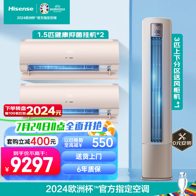 海信(Hisense)健康抑菌空调套装 二室一厅 上下分区送风一级能效客厅柜机 卧室家用挂机(1.5匹*2+3匹)价格:9297.00元!