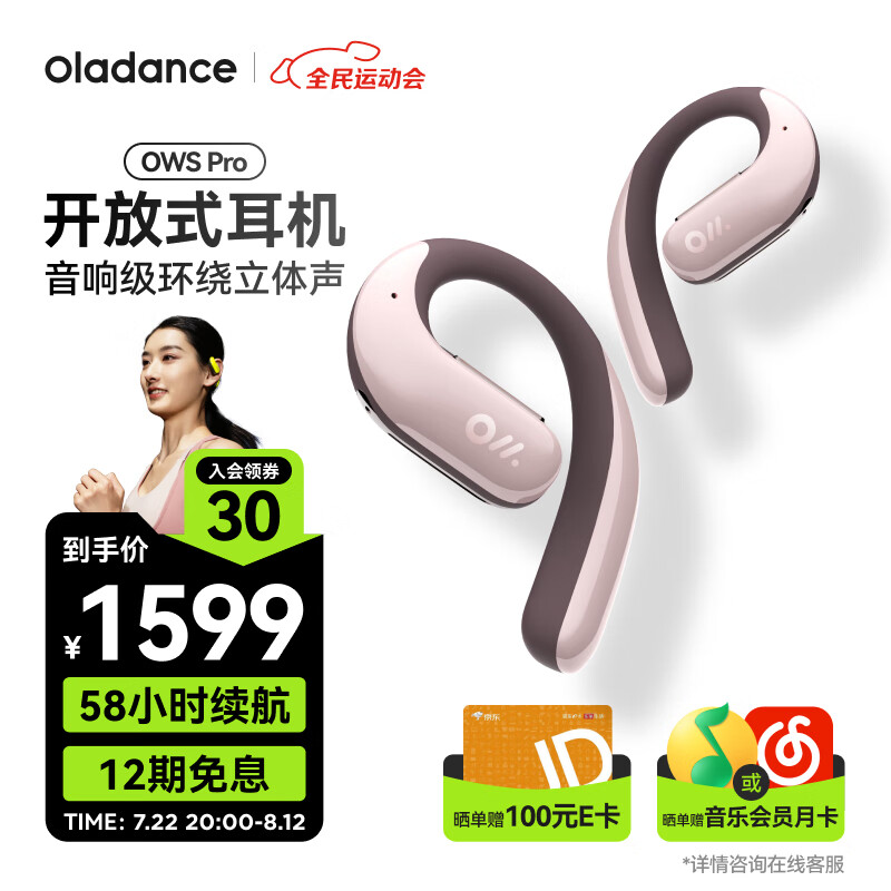 OladanceOWS Pro 全开放式耳机(含充电仓)无线蓝牙不入耳防漏音运动耳机超长续航【ola小月牙】 薄晕烟粉价格:1599.00元!