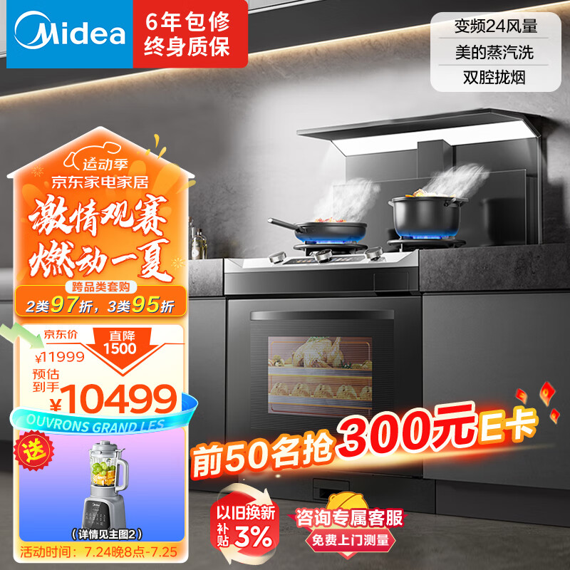 美的(Midea)晴空系列蒸烤一体集成灶 变频24风量油烟机 蒸汽洗 5.2kW燃气灶 大容量蒸烤炸 黑色FX90 天然气价格:10499.00元!
