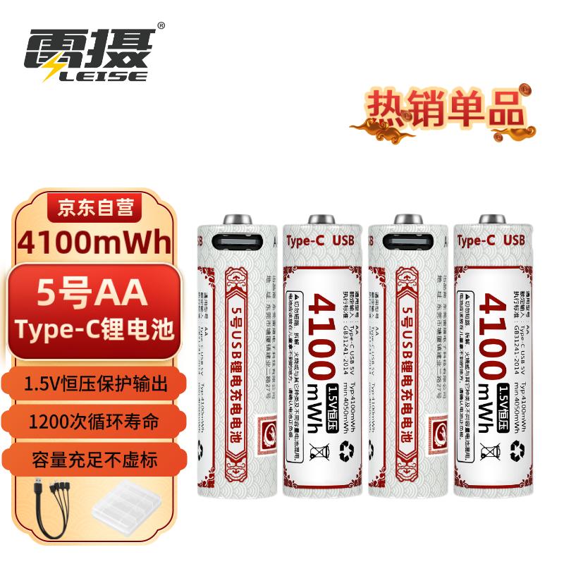 雷摄(LEISE)5号充电电池 USB锂电池 1.5V恒压 高性能USB-Type-C充电 4100mWh(4节)盒装 适用:无线鼠键/玩具价格:129.00元!