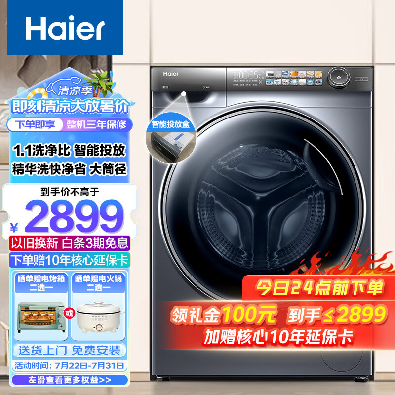 海尔(Haier)【精华洗】10KG滚筒洗衣机全自动家用变频大容量一级能效智能投放大筒径巴氏除菌洗G10028BD14LS价格:2999.00元!