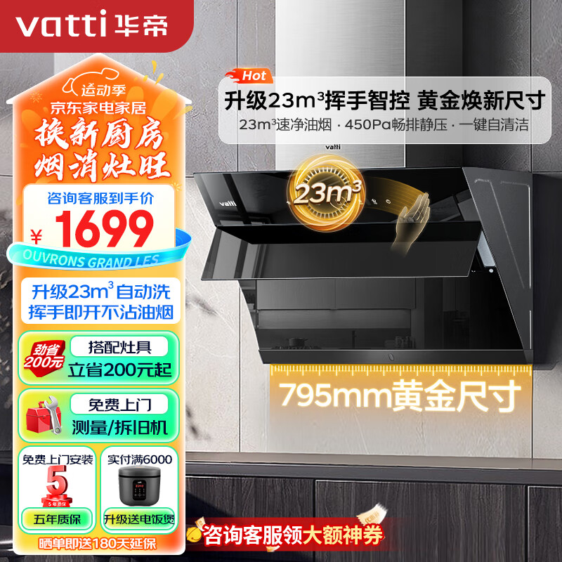 华帝(VATTI)官方抽油烟机侧吸式小尺寸家用脱排吸油烟机 23风量爆炒大吸力 挥手智控自动清洗 以旧换新 i11170价格:1699.00元!
