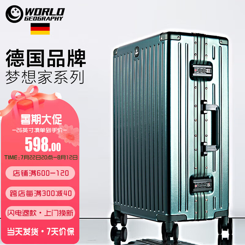 地理德国行李箱男女26英寸铝框旅行箱杯架拉杆箱万向轮密码箱 英伦绿价格:829.00元!